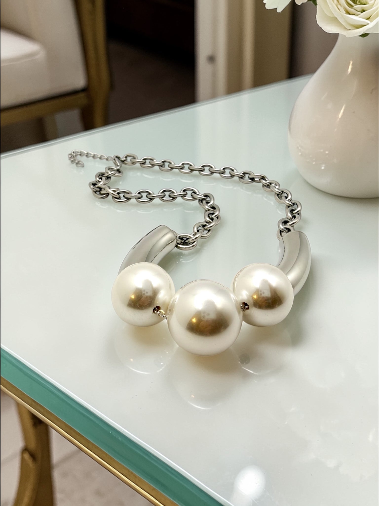 Three large pearls in the middle links necklace