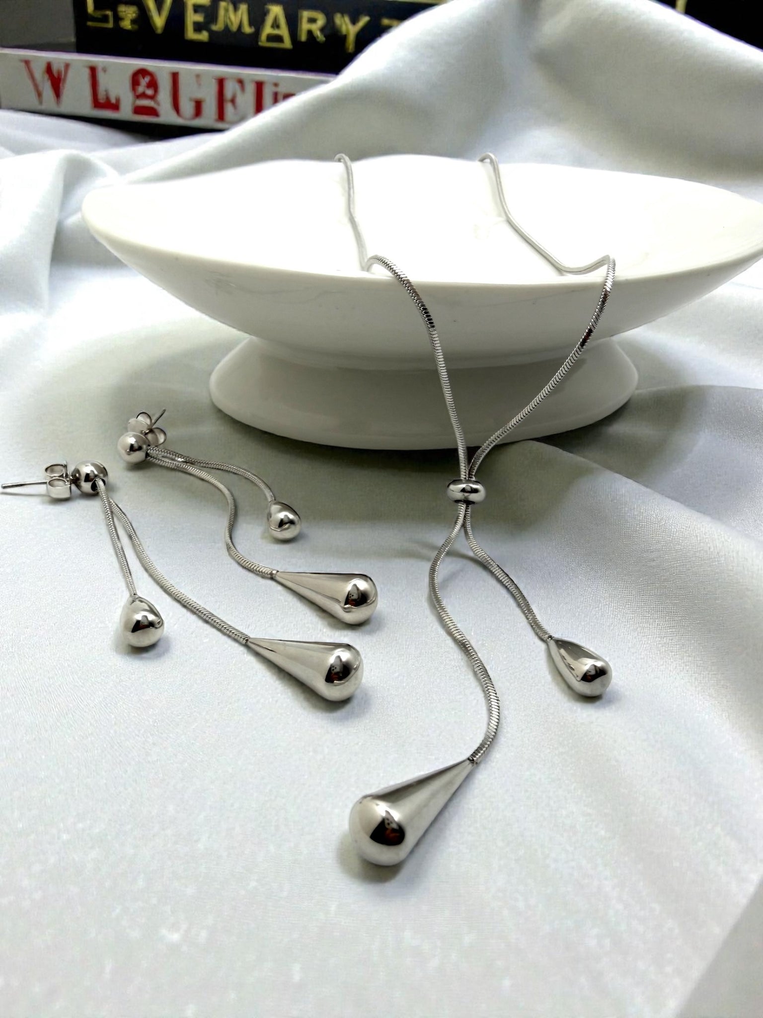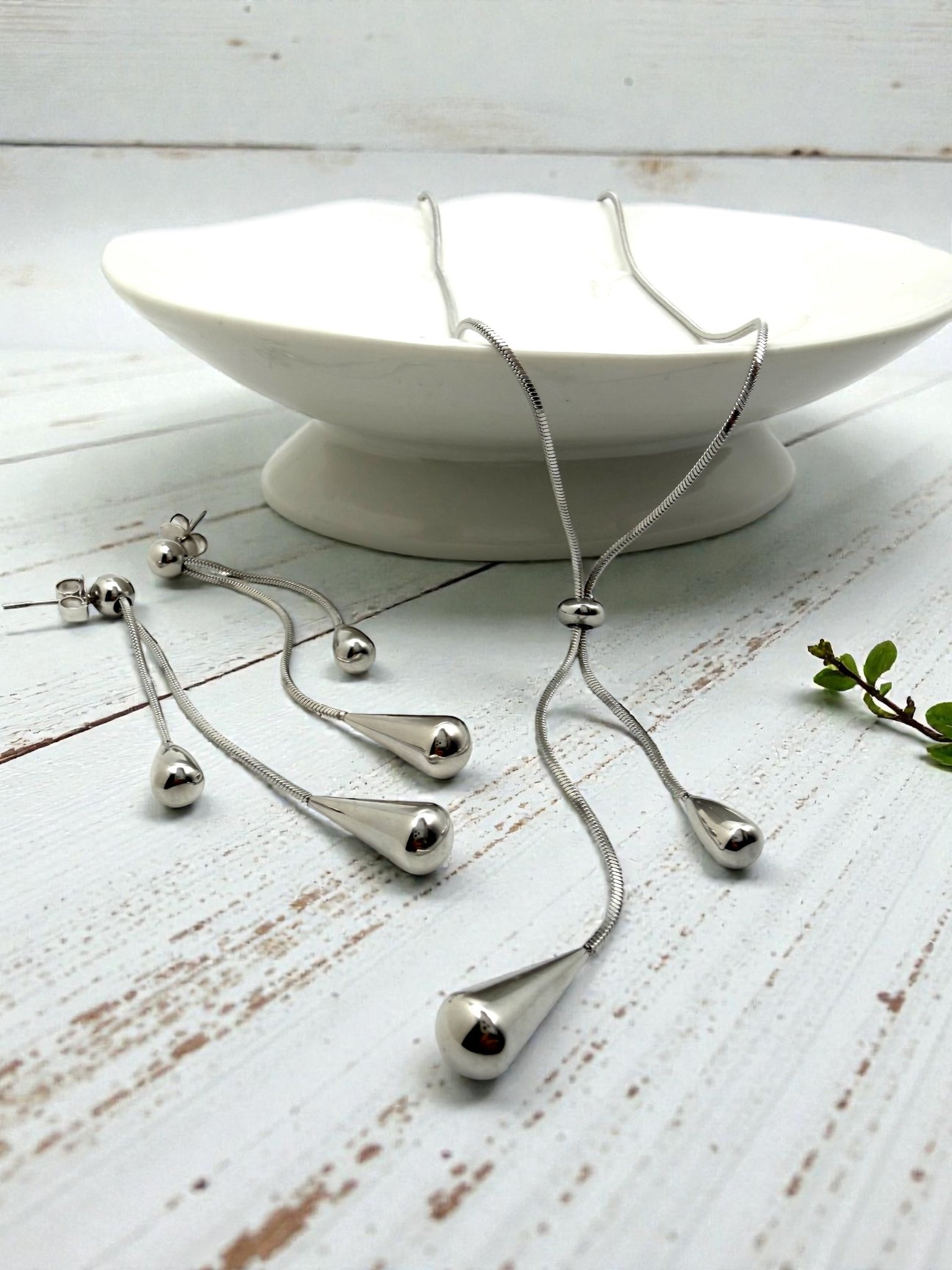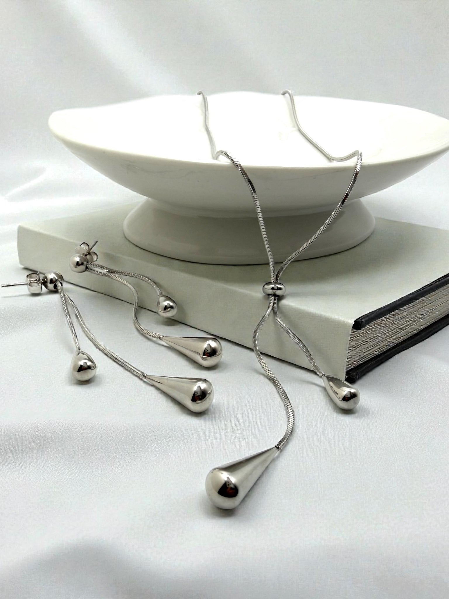 Tie jewelry set with teardrop shapes at the ends